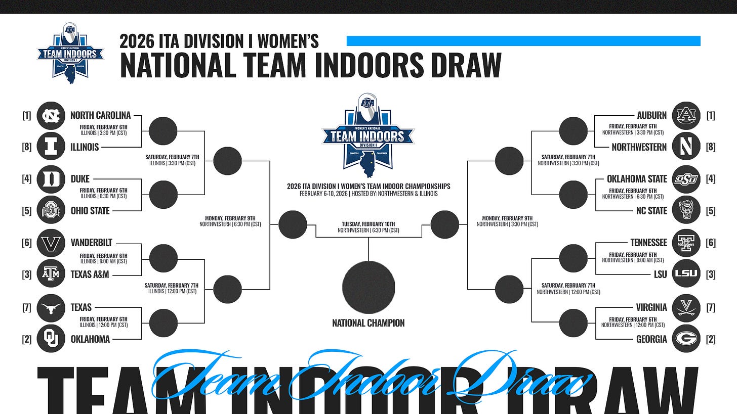 Winning indoor nationals is a banner-hanging, ring-ordering event, and a major landmark on the college tennis season on the way to the outdoor NCAA Championship tournament at season’s end. All 10 teams in the current top-10 rankings are in the state of Illinois for indoor nationals.